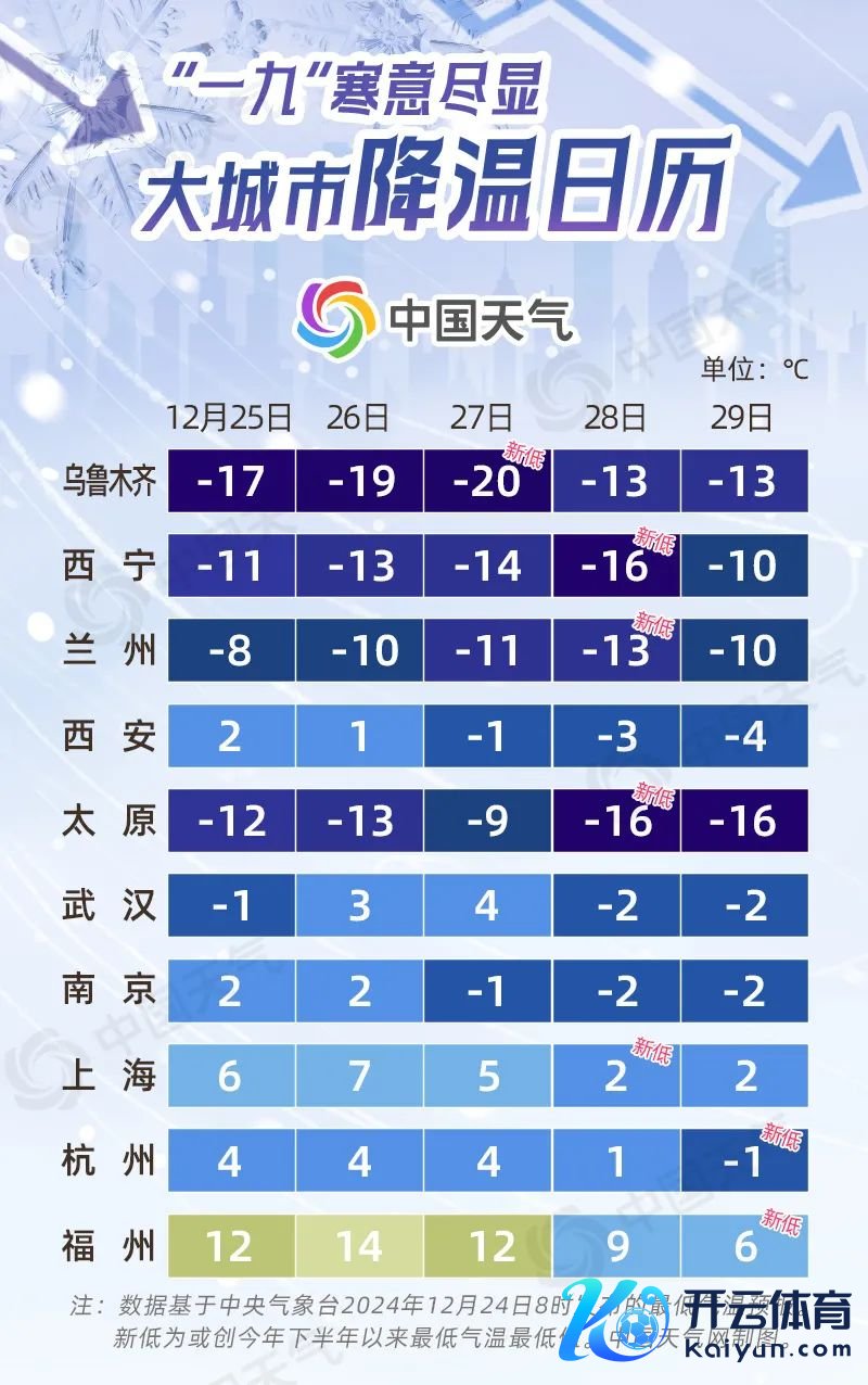 数九冷天,我国大部干预酷寒时节。都说“一九”“二九”不脱手,本年“一九”我国大部亦然在清凉中开场。翌日(12月25日)至27日,又将有较强冷空气影响我国,“一九”寒意尽显。中国天气网推出大城市降温日期,看哪些城市将创本年下半年来气温新低。