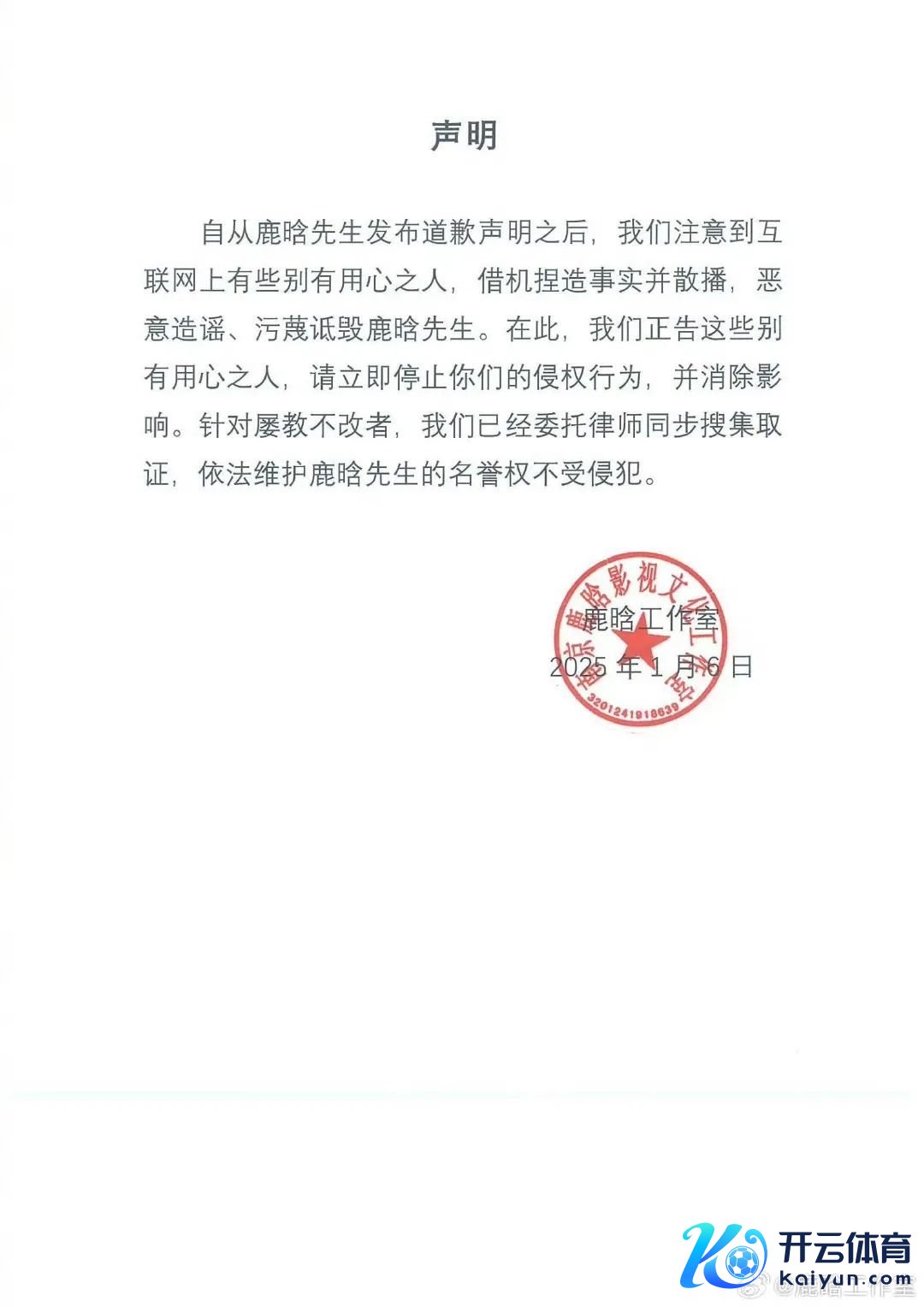 1月6日17:46,鹿晗责任室再次修起,发表声明称谈歉声明发布后,互联网别有精心之东谈主,借机持造事实并区别,坏心诽谤、诬陷谩骂鹿晗,责任室正告其罢手侵权行为,针对屡教不改者将照章维权。