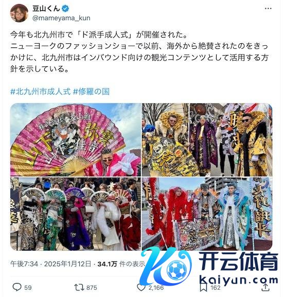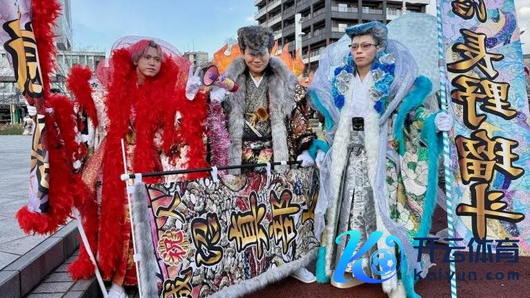 有日本网民晒出了本年北九囿市的“超等花哨的成东说念主庆典”。参与者们一稔夸张的衣饰,拿着夸张的扇子和旗帜等说念具,出场就能眩惑大家的眼神。